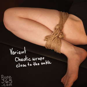 Time to get chaotic a little bit and improvise a tie. Instead of making clean wraps from ankle to knee, change direction so that the rope crosses on itself. Make as many wraps as you want!.
