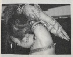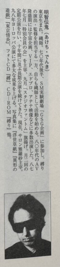 Excepts from 1999 Japanese book 性愛 大論点 about unconventional sex, including a very interesting interview with Akechi Denki and some pictures. In this interview, he describes how he avoids knots on the body to improve the feelings of the tie and how Edo period torture is a major inspiration for him.