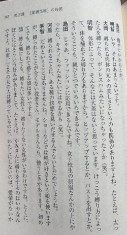 河原 ロープアーティスト・・・・・・何かその響きは、ボーイスカウトか何かのロープ術み たいですが・・・・・・(笑)。縛られている人は、苦痛じゃないんですか。