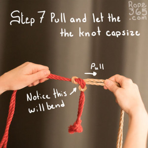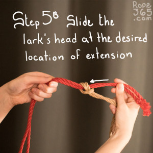 Opening the loops of a lark’s head will transform it into a square knot, this is a phenomenon called capsizing. This extension method starts the same way as the lark’s head extension but requires a few more steps. It allows for more flexibility in the location of the extension, works on any kind of rope, is more solid than the lark’s head extension but will leave a part of the tail hanging.